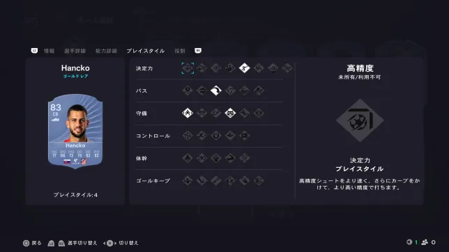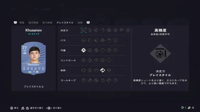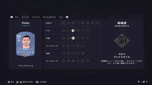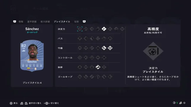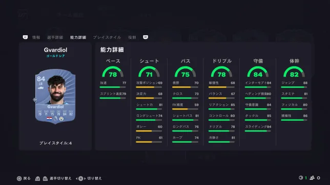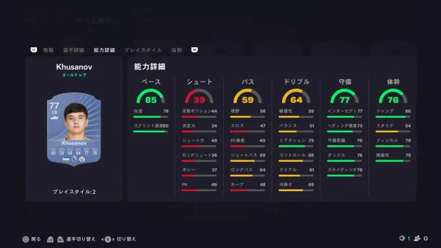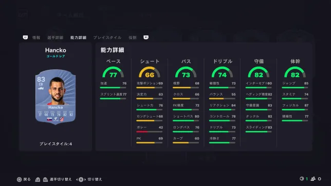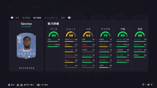 見ての通りスピードに全振りの選手となっていますが、プレイスタイル「ジョッキー」もあるので操作感は中々良いです。