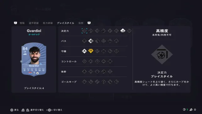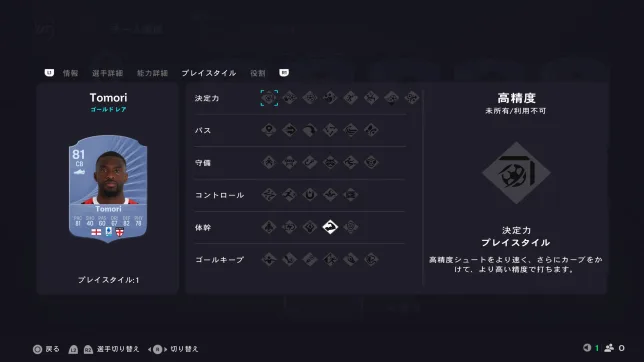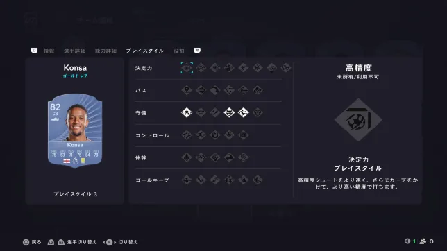 FC26では守備が難しくなっていて、相手のドリブルが中々止められません。CBが振り切られてシュートを打たれるシーンが多くなっているので、プレイスタイル「ジョッキー」は欲しいところ。