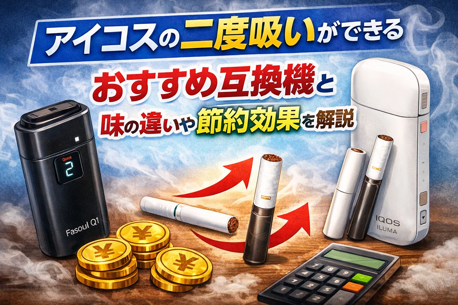 アイコスの二度吸いができるおすすめ互換機と味の違い、節約効果を解説した比較イメージ画像