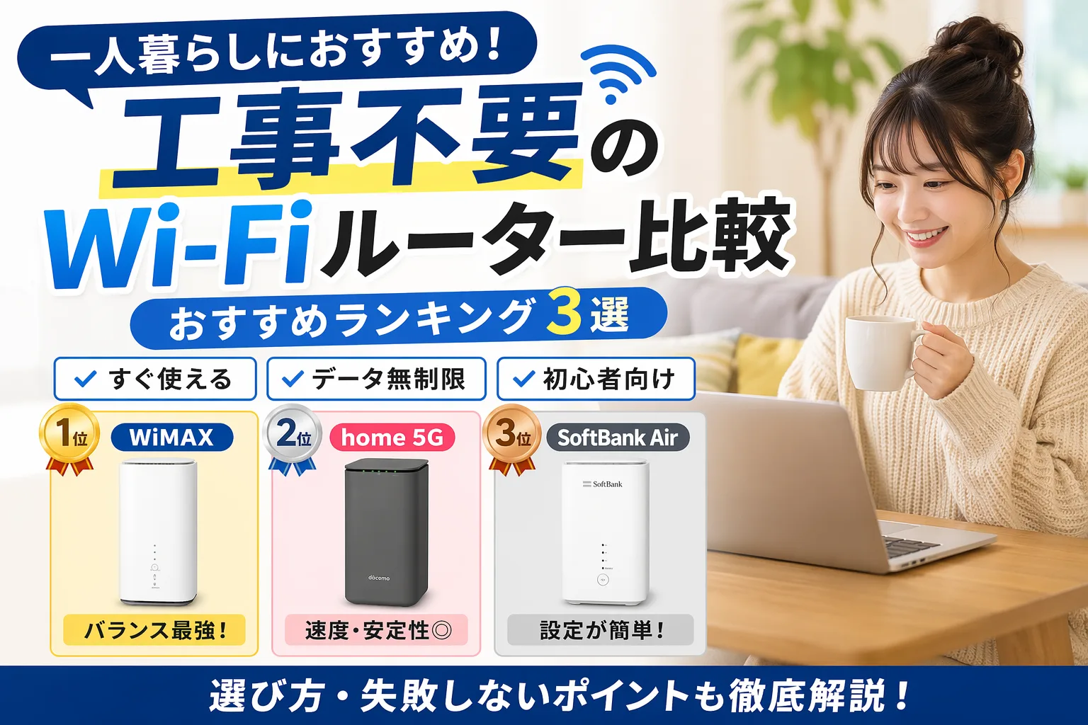 この記事では、一人暮らしのWi-Fiはどれがいい?と題して、工事不要で使えるホームルーターを徹底比較。WiMAX・home 5G・SoftBank Airのおすすめランキングと選び方を解説します。